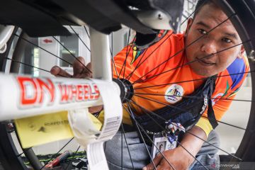 Teknisi 'On Wheels' Husin mengecek baut kursi roda di lapangan tenis Sian Soor, Jayapura, Papua, Rabu (10/11/2021). Panitia Penyelengara Peparnas menyediakan jasa perbaikan kursi roda gratis untuk atlet Peparnas. ANTARA FOTO/Indrayadi TH/foc.