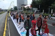 Warga memakai Batik berjalan bersama saat mengikuti peragaan busana Mandiri Hari Batik 2022 di kawasan Car Free Day (CFD) Jl.Jend Sudirman, Jakarta, Minggu (2/10/2022). Even tersebut digelar sebagai rangkaian kegiatan Hari Batik Nasional dan HUT Bank Mandiri Ke-24 pada 2 Oktober, yang juga didukung oleh Kementerian Perindustrian. ANTARA FOTO/Reno Esnir/foc.