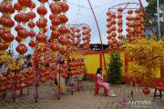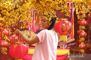 WSeorang warga keturunan Tionghoa berdiri di antara pepohonan yang dihiasi lampion di halaman Vihara Tri Dharma Hian Tian Siang Tie atau Vihara Budha Kutub Utara di Sungai Kakap, Kabupaten Kubu Raya, Kalimantan Barat, Senin (23/1/2023). Warga Kota Pontianak dan Kabupaten Kubu Raya mengisi hari libur cuti bersama Imlek dengan mendatangi vihara tersebut yang disemarakkan dengan berbagai hiasan bernuansa Imlek. ANTARA FOTO/Jessica Helena Wuysang/aww.