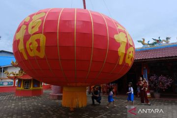 Sejumlah warga keturunan Tionghoa berjalan di bawah lampion Imlek raksasa di pelataran Vihara Tri Dharma Hian Tian Siang Tie atau Vihara Budha Kutub Utara di Sungai Kakap, Kabupaten Kubu Raya, Kalimantan Barat, Senin (23/1/2023). Warga Kota Pontianak dan Kabupaten Kubu Raya mengisi hari libur cuti bersama Imlek dengan mendatangi vihara tersebut yang disemarakkan dengan berbagai hiasan bernuansa Imlek. ANTARA FOTO/Jessica Helena Wuysang/aww.