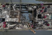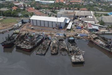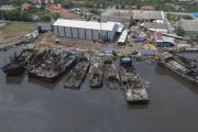 Foto udara kondisi kapal pasca kebakaran saat kepolisian melakukan identifikasi di Panjang Wetan, Kota Pekalongan, Jawa Tengah, Rabu (13/11/2024). Petugas Inafis Polda Jateng dan Polres Pekalongan Kota masih mengumpulkan barang bukti bagian-bagian penyebab kebakaran 11 kapal untuk kemudian dilakukan uji laboratoium forensik. ANTARA FOTO/Harviyan Perdana Putra/foc.