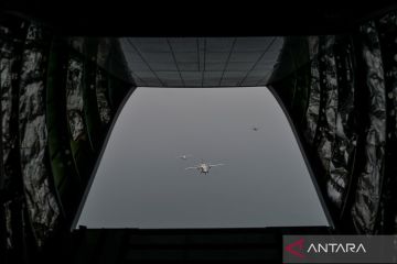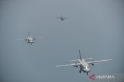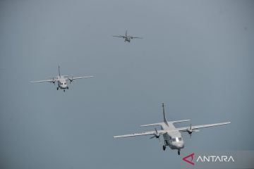 Pesawat Casa NC 212 TNI AU dan TNI AL melakukan terbang formasi dalam rangka HUT ke-80 TNI di atas Teluk Jakarta usai lepas landas dari Bandara Husein Sastranegara, Bandung, Jawa Barat, Minggu (5/10/2025). Sebanyak 10 pesawat Casa NC 212 milik TNI AU dan TNI AL dengan Call Sign Wallet Flight mengikuti terbang formasi dalam rangka HUT ke-80 TNI yang lepas landas dari Bandara Husein Sastranegara menuju Lapangan Monas, Jakarta yang dipimpin oleh Komandan Squadron 4 TNI AU Letkol Penerbang M. Susilo AdiSaputro. ANTARA FOTO/Raisan Al Farisi/sgd