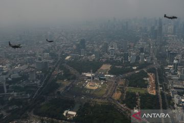 Pesawat Casa NC 212 TNI AU dan TNI AL melakukan terbang formasi dalam rangka HUT ke-80 TNI di atas langit Monas, Jakarta usai lepas landas dari Bandara Husein Sastranegara, Bandung, Jawa Barat, Minggu (5/10/2025). Sebanyak 10 pesawat Casa NC 212 milik TNI AU dan TNI AL dengan Call Sign Wallet Flight mengikuti terbang formasi dalam rangka HUT ke-80 TNI yang lepas landas dari Bandara Husein Sastranegara menuju Lapangan Monas, Jakarta yang dipimpin oleh Komandan Squadron 4 TNI AU Letkol Penerbang M. Susilo AdiSaputro. ANTARA FOTO/Raisan Al Farisi/sgd